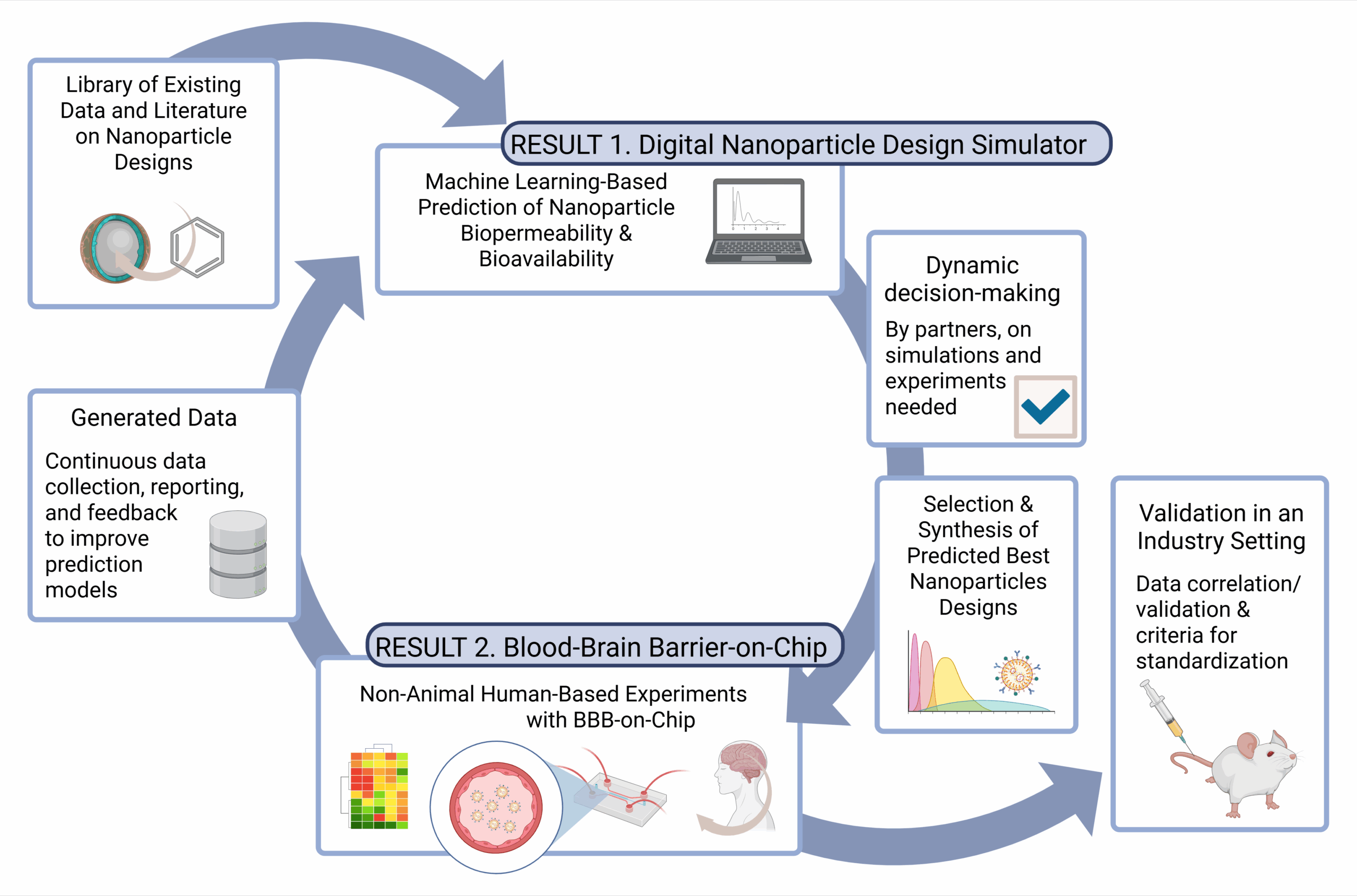 A digital repository of optimized nanoparticle designs “NP Design Library” will be created to gather publicly available and newly obtained NP characterisation data, specialised for BBB delivery. The design simulator screens thousands of NP designs to recommend the most promising ones, which will be tested in vitro on the microfluidic BBB-on-Chip with real-time measurement of barrier integrity. The accuracy and physiological relevance of both tools will be validated by the pharmaceutical partner through comparison with clinical and preclinical data.